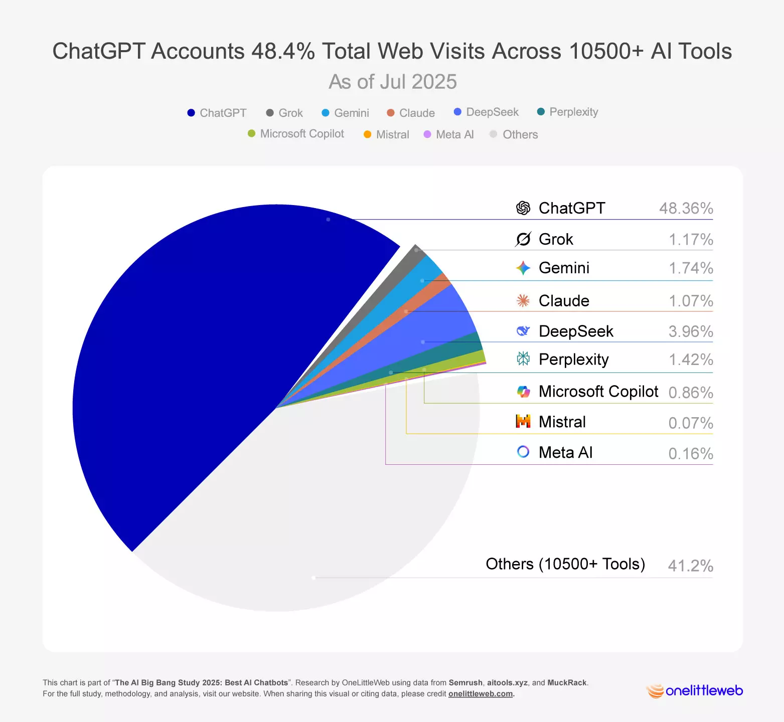 Podľa štúdie One Little Web2025 bolo analyzovaných viac ako 10 500 AI nástrojov, ktoré generujú spolu takmer 100 miliárd návštev webu. Výsledkom je rebríček 10 najlepších chatbotov – pozrite obrázok.